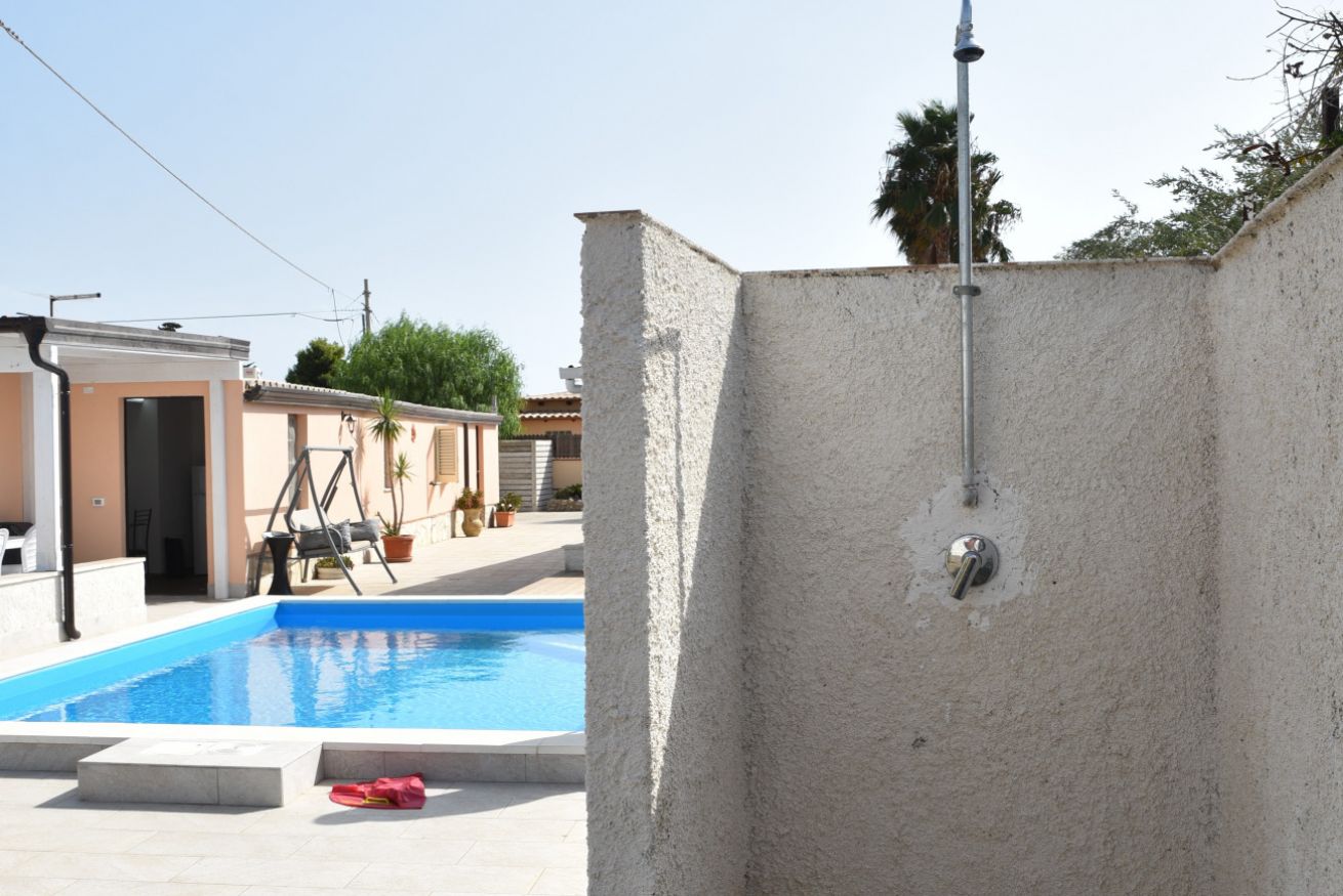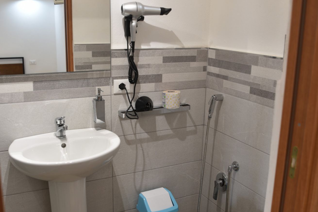 Camera matrimoniale con bagno privato con doccia, e cucina e spazi esterni in comune.